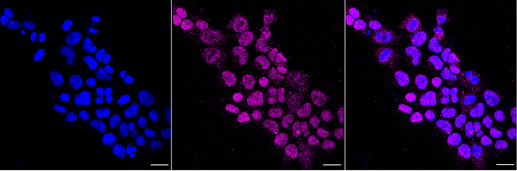 • Immunocytochemical staining of Hela cells with CD163 antibody. Nuclei were stained blue with DAPI; CD163 was stained magenta with Alexa Fluor? 647. Images were taken using Leica stellaris 5. Protein abundance based on laser Intensity and smart gain: Medium. Scale bar, 20 μm.