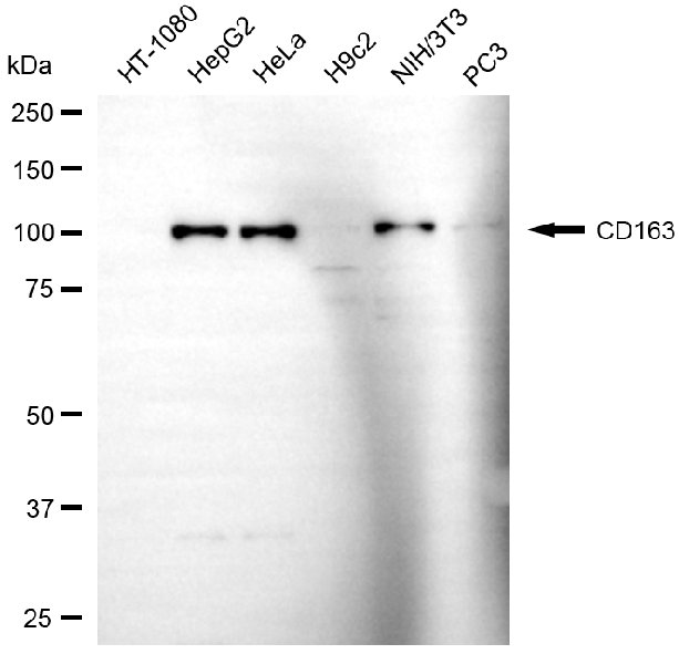 • Western blotting analysis using CD163 antibody. Total cell lysates (30 μg) from various cell lines were loaded and separated by SDS-PAGE. The blot was incubated with CD163 antibody and HRP-conjugated goat anti-rabbit secondary antibody respectively.