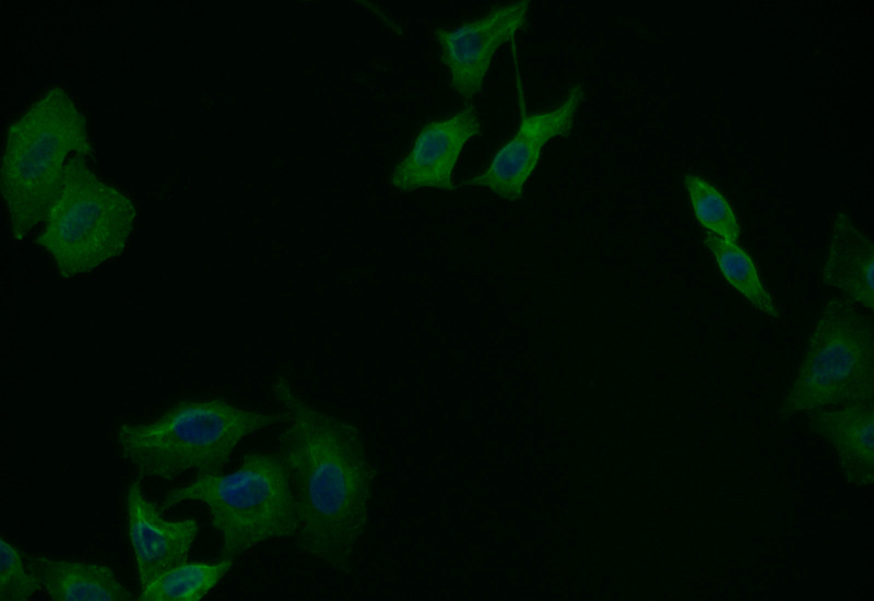 Immunofluorescence staining of Hela with CSB-RA292372A0HU at 1:25, counter-stained with DAPI. The cells were fixed in 4% formaldehyde and blocked in 10% normal Goat Serum. The cells were then incubated with the antibody overnight at 4°C. The secondary antibody was Alexa Fluor 515-congugated AffiniPure Goat Anti-Rabbit IgG(H+L).