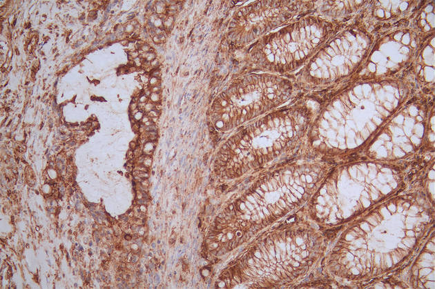 IHC image of CSB-RA292372A0HU diluted at 1:50 and staining in paraffin-embedded human rectal cancer performed on a Leica BondTM system. After dewaxing and hydration, antigen retrieval was mediated by high pressure in a citrate buffer (pH 6.0). Section was blocked with 10% normal goat serum 30min at RT. Then primary antibody (1% BSA) was incubated at 4°C overnight. The primary is detected by a Goat anti-rabbit polymer IgG labeled by HRP and visualized using 0.51% DAB.