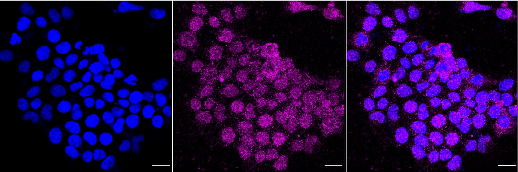 Immunocytochemical staining of Hela cells with CD58 antibody. Nuclei were stained blue with DAPI; CD58 was stained magenta with Alexa Fluor? 647. Images were taken using Leica stellaris 5. Protein abundance based on laser Intensity and smart gain: Low. Scale bar, 20 μm.
