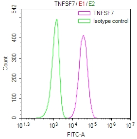 • Overlay Peak curve showing 786-O cells surface stained with CSB-RA004954MA3HU (red line) at 1:100. Then 10% normal goat serum to block non-specific protein-protein interactions followed by the antibody (1ug/1*106cells) for 45min at 4℃. The secondary antibody used was FITC-conjugated Goat Anti-Mouse IgG(H+L) at 1:200 dilution for 35min at 4℃.Control antibody (green line) was mouse IgG2a (1ug/1*106cells) used under the same conditions. Acquisition of >10,000 events was performed.