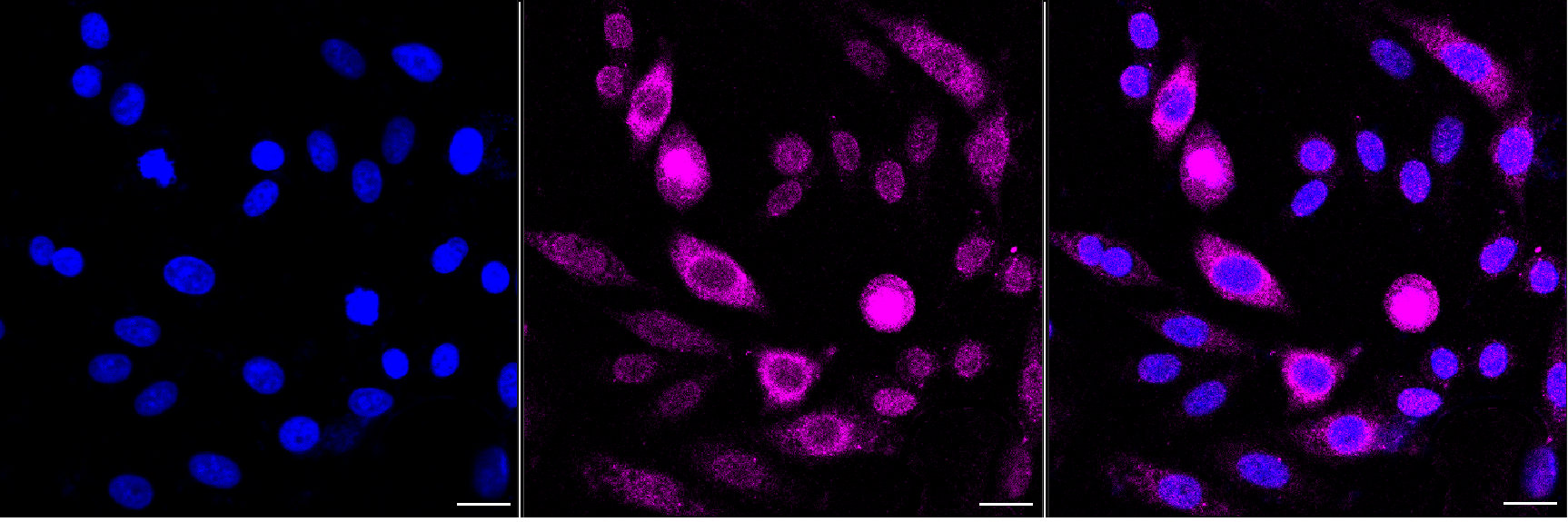 • Immunocytochemical staining of HepG2 cells with Phospho-CDC6 (Ser106) antibody. Nuclei were stained blue with DAPI; Phospho-CDC6 (Ser106) was stained magenta with Alexa Fluor? 647. Images were taken using Leica stellaris 5. Protein abundance based on laser Intensity and smart gain: Medium. Scale bar, 20 μm.