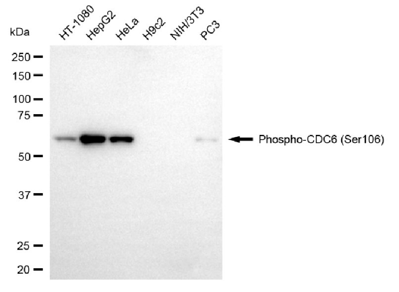 • Western blotting analysis using phospho-CDC6 (Ser106) antibody. Total cell lysates (30 μg) from various cell lines were loaded and separated by SDS-PAGE. The blot was incubated with phospho-CDC6 (Ser106) antibody and HRP-conjugated goat anti-rabbit secondary antibody respectively.