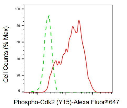 Flow cytometric analysis of phospho-Cdk2 (Y15) expression in C2C12 cells using phospho-Cdk2 (Y15) antibody. Green, isotype control; red, phospho-Cdk2 (Y15).