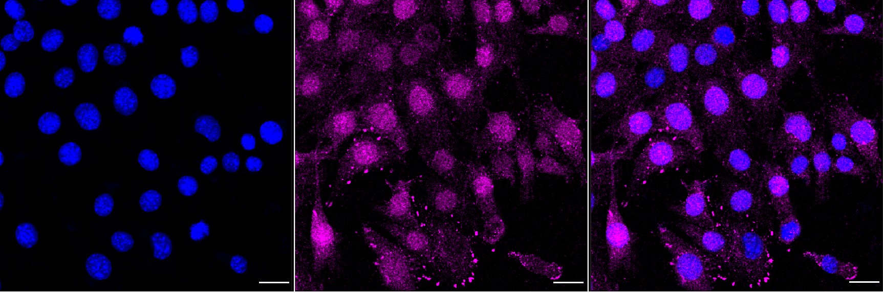 Immunocytochemical staining of C2C12 cells with Phospho-Cdk2 (Y15) antibody. Nuclei were stained blue with DAPI; Phospho-Cdk2 (Y15) was stained magenta with Alexa Fluor? 647. Images were taken using Leica stellaris 5. Protein abundance based on laser Intensity and smart gain: Medium. Scale bar, 20 μm.