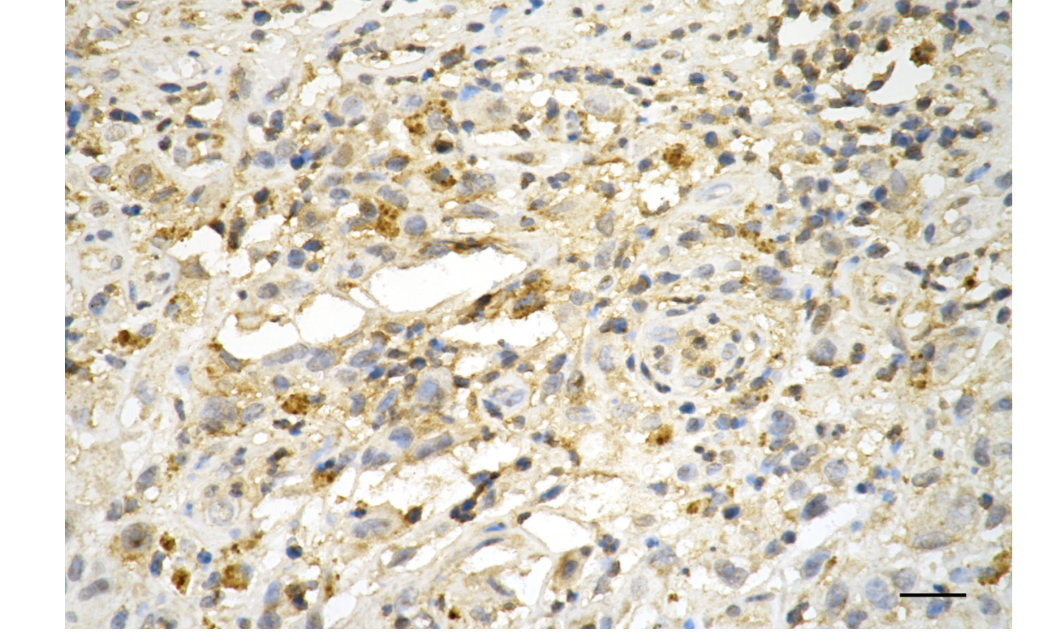Immunohistochemistry was performed on paraffin-embedded human melanoma using phospho-cdk2 (Y15) antibody. Antigen retrieval was done in sodium citrate buffer (pH 6.0). DAB was used for detection, with hematoxylin counterstaining. Images were acquired using a Nikon Ci-L Plus microscope (40× objective). Scale bar: 25 μm.