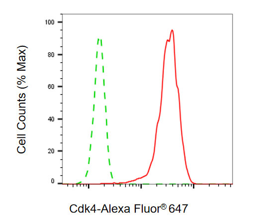 • Flow cytometric analysis of Cdk4 expression in HepG2 cells using Cdk4 antibody. Green, isotype control; red, Cdk4.
