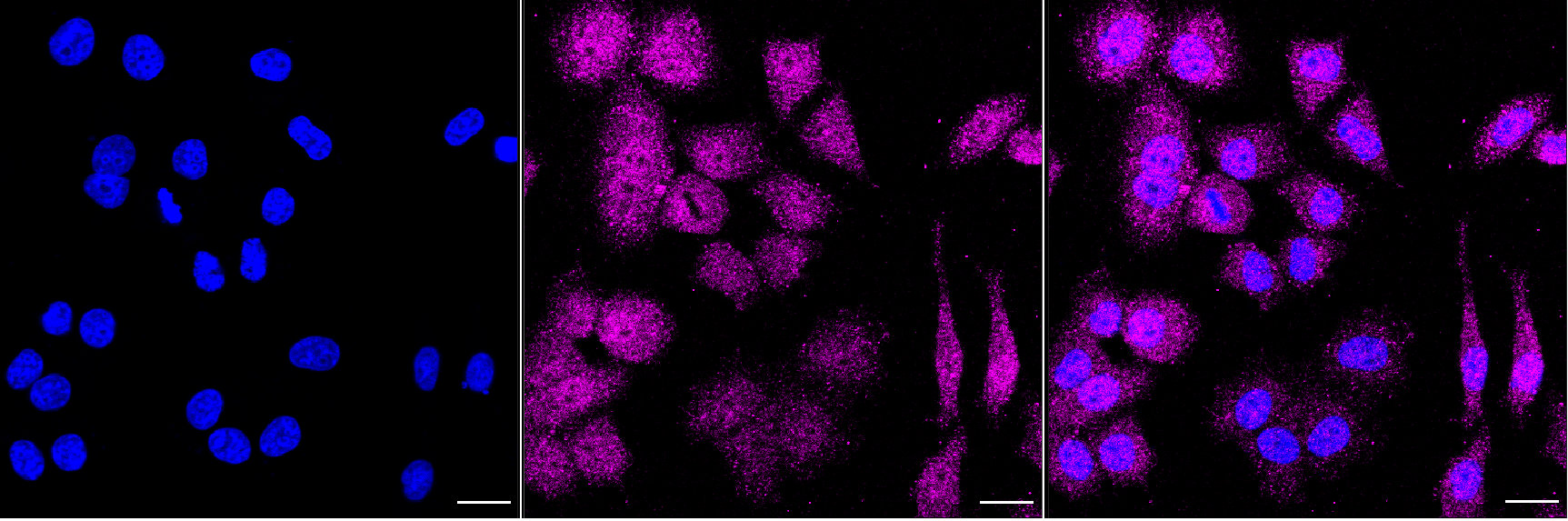 • Immunocytochemical staining of HepG2 cells with CDK4 antibody. Nuclei were stained blue with DAPI; CDK4 was stained magenta with Alexa Fluor? 647. Images were taken using Leica stellaris 5. Protein abundance based on laser Intensity and smart gain: Medium. Scale bar, 20 μm.