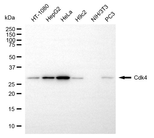 • Western blotting analysis using Cdk4 antibody. Total cell lysates (30 μg) from various cell lines were loaded and separated by SDS-PAGE. The blot was incubated with Cdk4 antibody and HRP-conjugated goat anti-rabbit secondary antibody respectively.