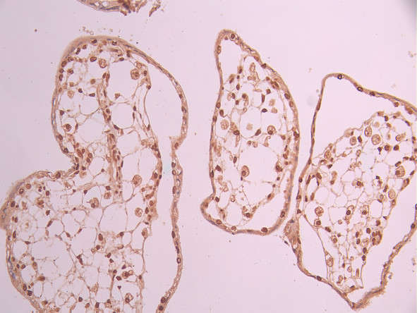 IHC image of CSB-RA914462A0HU diluted at 1:100 and staining in paraffin-embedded human placenta tissue performed on a Leica BondTM system. After dewaxing and hydration, antigen retrieval was mediated by high pressure in a citrate buffer (pH 6.0). Section was blocked with 10% normal goat serum 30min at RT. Then primary antibody (1% BSA) was incubated at 4°C overnight. The primary is detected by a Goat anti-rabbit polymer IgG labeled by HRP and visualized using 0.05% DAB.