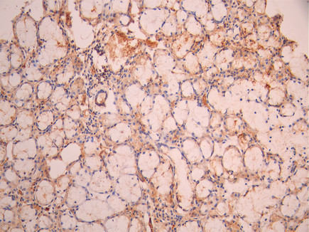 IHC image of CSB-RA005166MA1HU diluted at 1:50 and staining in paraffin-embedded human small intestine tissue performed on a Leica BondTM system. After dewaxing and hydration, antigen retrieval was mediated by high pressure in a citrate buffer (pH 6.0). Section was blocked with 10% normal goat serum 30min at RT. Then primary antibody (1% BSA) was incubated at 4°C overnight. The primary is detected by a Anti-Human lgG, Fcy Fragment Specific labeled by HRP and visualized using 0.05% DAB.