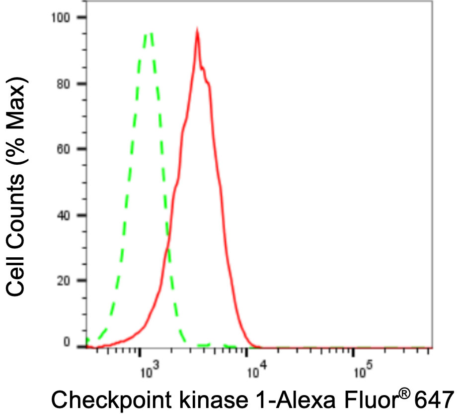 • Flow cytometric analysis of Checkpoint kinase 1 expression in HepG2 cells using Checkpoint kinase 1 antibody. Green, isotype control; red, Checkpoint kinase 1.