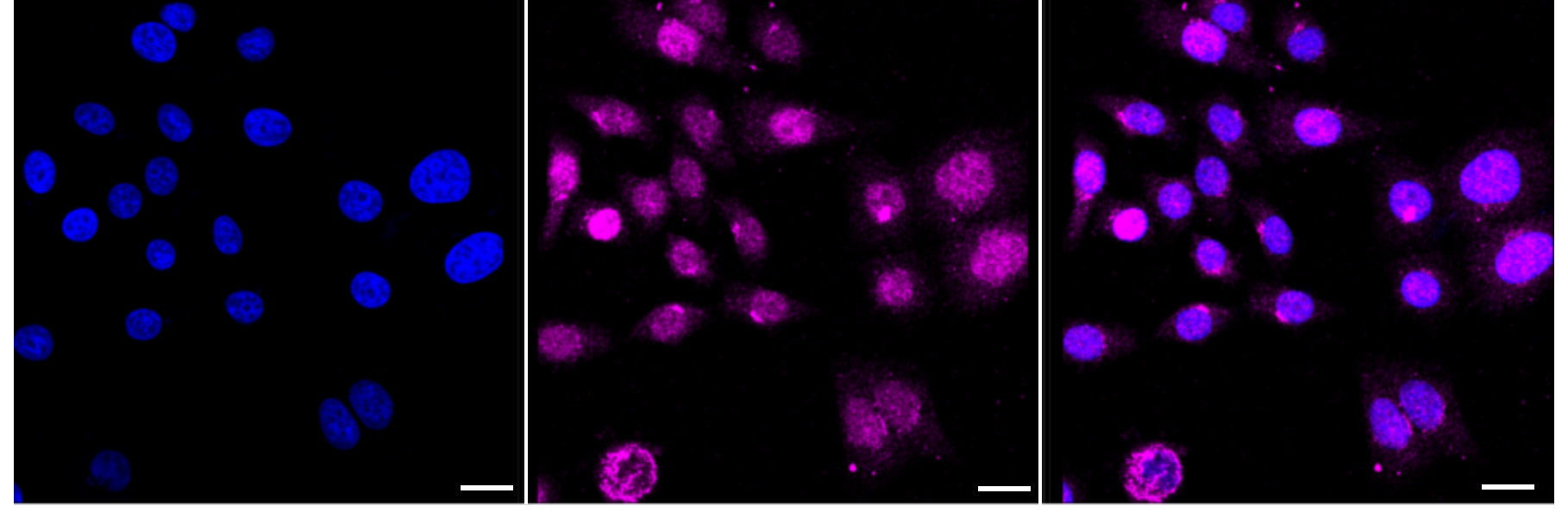 • Immunocytochemical staining of HepG2 cells with Checkpoint kinase 1 antibody. Nuclei were stained blue with DAPI; Checkpoint kinase 1 was stained magenta with Alexa Fluor? 647. Images were taken using leica stellaris 5. Protein abundance based on laser intensity and smart gain: Medium. Scale bar: 20 μm.