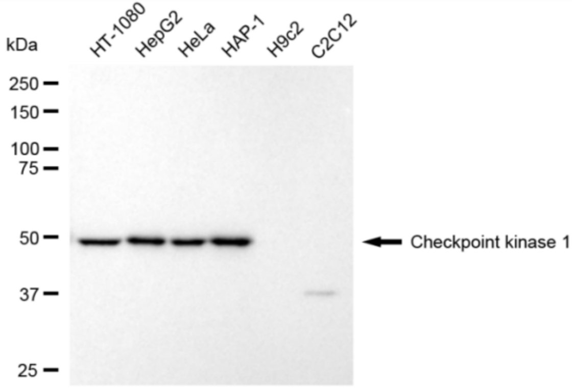 • Western blotting analysis using Checkpoint kinase 1 antibody. Total cell lysates (30 μg) from various cell lines were loaded and separated by SDS-PAGE. The blot was incubated with Checkpoint kinase 1 antibody and HRP-conjugated goat anti-rabbit secondary antibody respectively.