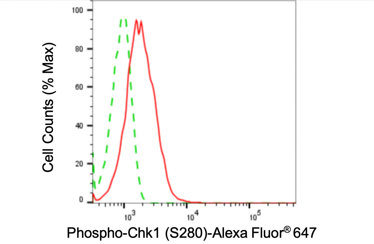 Flow cytometric analysis of phospho-chk1 (S280) expression in HeLa cells using phospho-chk1 (S280) antibody. Green, isotype control; red, phospho-chk1 (S280).