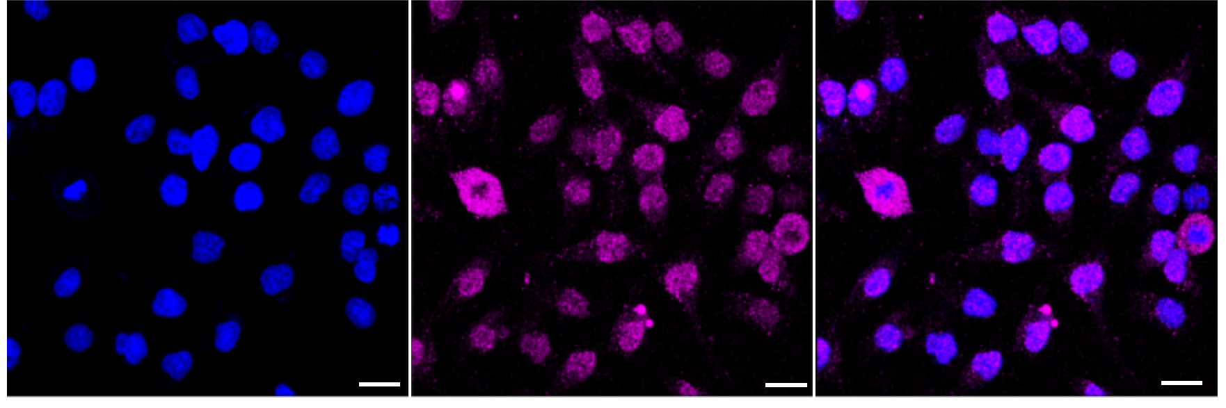 Immunocytochemical staining of HeLa cells with Phospho-Chk1 (S280) antibody. Nuclei were stained blue with DAPI; Phospho-Chk1 (S280) was stained magenta with Alexa Fluor? 647. Images were taken using Leica stellaris 5. Protein abundance based on laser Intensity and smart gain: Medium. Scale bar: 20 μm.
