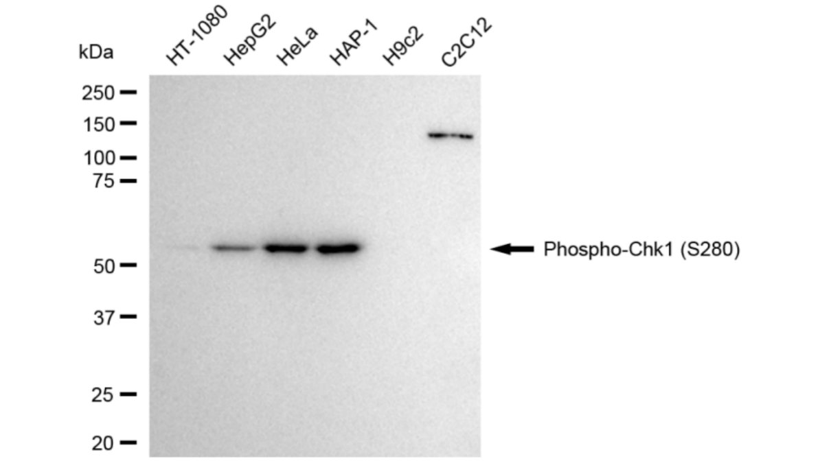 Western blotting analysis using phospho-chk1 (S280) antibody. Total cell lysates (30 μg) from various cell lines were loaded and separated by SDS-PAGE. The blot was incubated with phospho-chk1 (S280) antibody and HRP-conjugated goat anti-rabbit secondary antibody respectively.