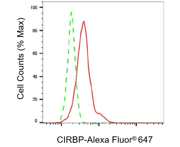 • Flow cytometric analysis of CIRBP expression in HepG2 cells using CIRBP antibody. Green, isotype control; red, CIRBP.