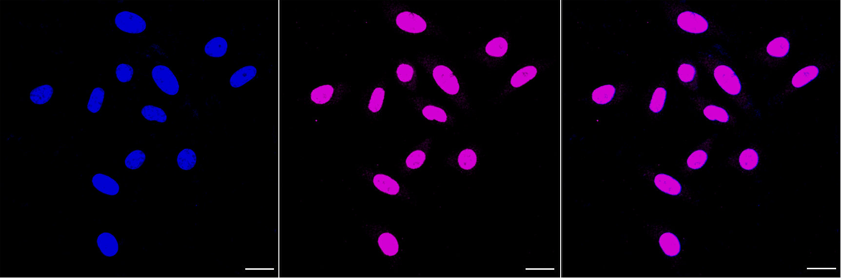 • Immunocytochemical staining of HepG2 cells with CIRBP antibody. Nuclei were stained blue with DAPI; CIRBP was stained magenta with Alexa Fluor? 647. Images were taken using Leica stellaris 5. Protein abundance based on laser Intensity and smart gain: High. Scale bar, 20 μm.