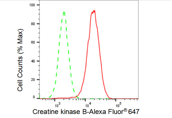 Flow cytometric analysis of Creatine kinase B expression in HAP-1 cells using Creatine kinase B antibody. Green, isotype control; red, Creatine kinase B.