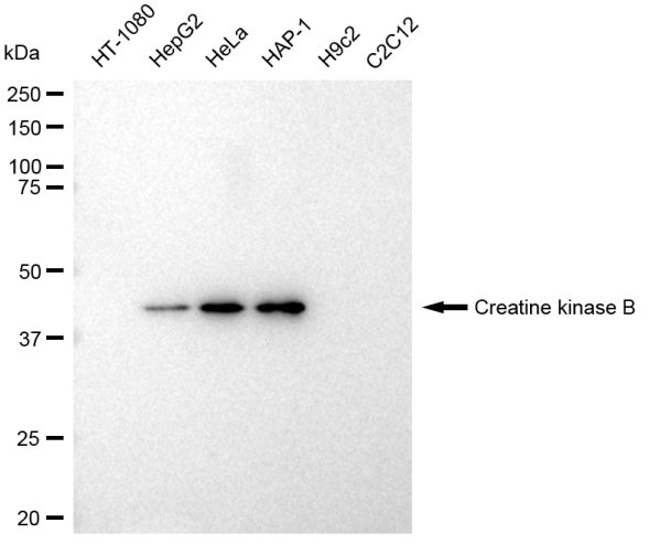 Western blotting analysis using Creatine kinase B antibody. Total cell lysates (30 μg) from various cell lines were loaded and separated by SDS-PAGE. The blot was incubated with Creatine kinase B antibody and HRP-conjugated goat anti-rabbit secondary antibody respectively.