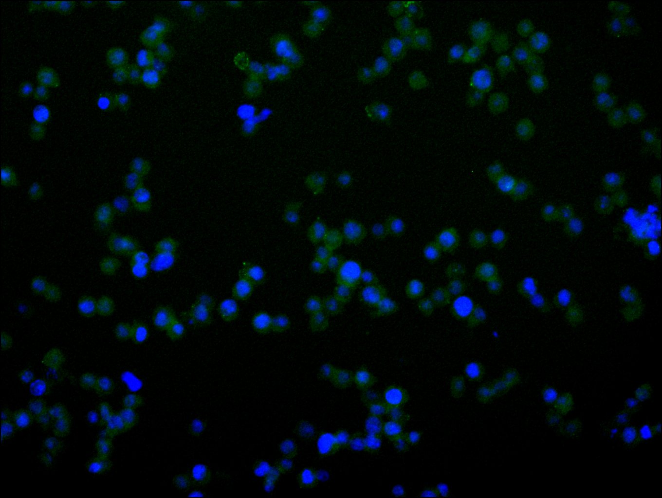 • Immunofluorescence staining of Jurkat cell with CSB-RA928719A0HU at 1:50, counter-stained with DAPI. The cells were fixed in 4% formaldehyde, permeabilized using 0.2% Triton X-100 and blocked in 10% normal Goat Serum. The cells were then incubated with the antibody overnight at 4°C. The secondary antibody was Alexa Fluor 488-congugated AffiniPure Goat Anti-Rabbit IgG(H+L).