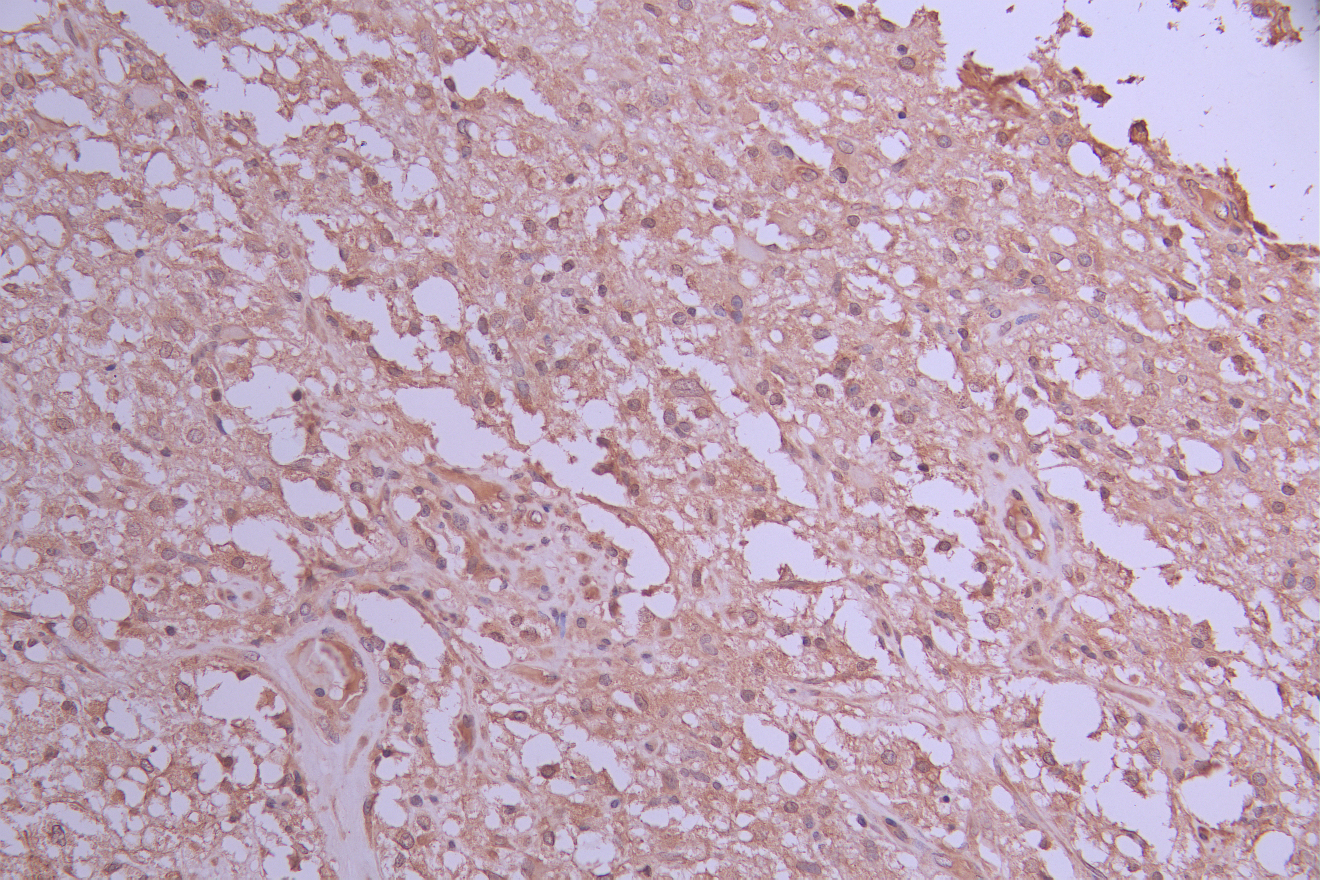 • IHC image of CSB-RA928719A0HU diluted at 1:100 and staining in paraffin-embedded human glioma cancer performed on a Leica BondTM system. After dewaxing and hydration, antigen retrieval was mediated by high pressure in a citrate buffer (pH 6.0). Section was blocked with 10% normal goat serum 30min at RT. Then primary antibody (1% BSA) was incubated at 4°C overnight. The primary is detected by a Goat anti-rabbit polymer IgG labeled by HRP and visualized using 0.05% DAB.