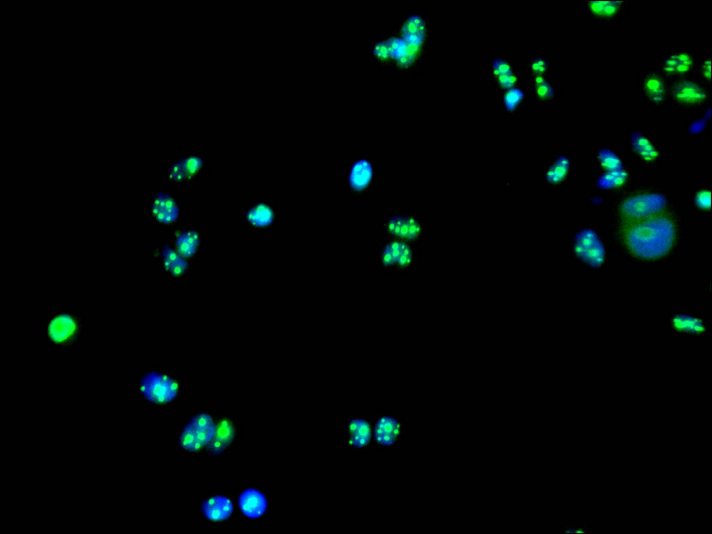 Immunofluorescence staining of MCF-7 cell with CSB-RA134191A0HU at 1:50, counter-stained with DAPI. The cells were fixed in 4% formaldehyde and blocked in 10% normal Goat Serum. The cells were then incubated with the antibody overnight at 4°C. The secondary antibody was Alexa Fluor 488-congugated AffiniPure Goat Anti-Rabbit IgG(H+L).