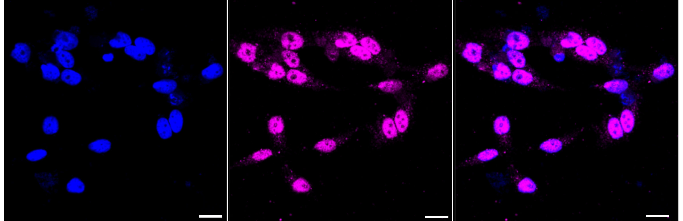 Immunocytochemical staining of Hela cells with CRTC3 antibody. Nuclei were stained blue with DAPI; CRTC3 was stained magenta with Alexa Fluor? 647. Images were taken using Leica stellaris 5. Protein abundance based on laser Intensity and smart gain: Medium. Scale bar: 20 μm.