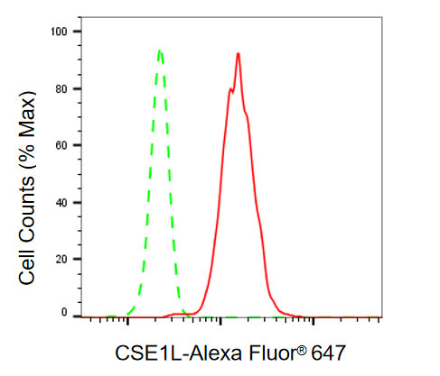 Flow cytometric analysis of CSE1L expression in HeLa cells using CSE1L antibody. Green, isotype control; red, CSE1L.