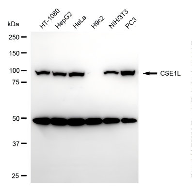 Western blotting analysis using CSE1L antibody. Total cell lysates (30 μg) from various cell lines were loaded and separated by SDS-PAGE. The blot was incubated with CSE1L antibody and HRP-conjugated goat anti-rabbit secondary antibody respectively.