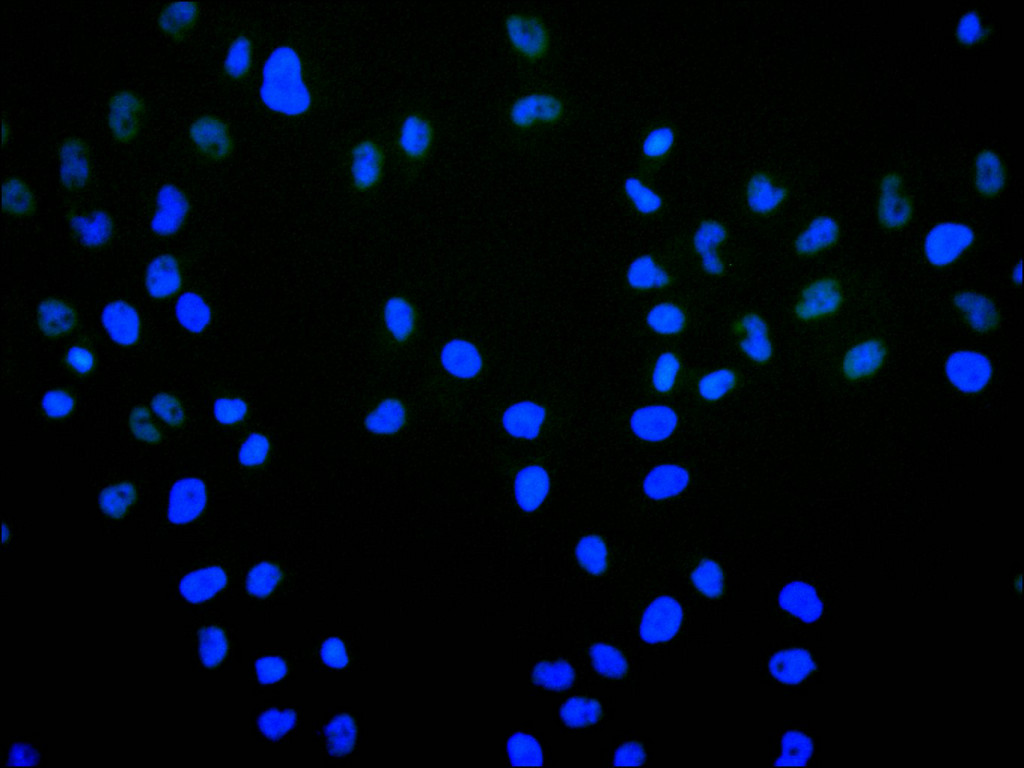 Immunofluorescence staining of HeLa cell with CSB-RA257842A0HU at 1:50 , counter-stained with DAPI. The cells were fixed in 4% formaldehyde, permeabilized using 0.2% Triton X-100 and blocked in 10% normal Goat Serum. The cells were then incubated with the antibody overnight at 4°C. The secondary antibody was Alexa Fluor 488-congugated AffiniPure Goat Anti-Rabbit IgG(H+L).