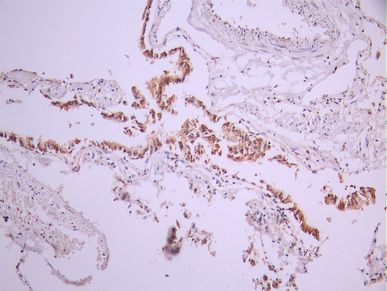 IHC image of CSB-RA257842A0HU diluted at 1:100 and staining in paraffin-embedded human lung tissue performed on a Leica BondTM system. After dewaxing and hydration, antigen retrieval was mediated by high pressure in a citrate buffer (pH 6.0). Section was blocked with 10% normal goat serum 30min at RT. Then primary antibody (1% BSA) was incubated at 4°C overnight. The primary is detected by a Goat anti-rabbit polymer IgG labeled by HRP and visualized using 0.05% DAB.