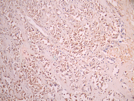IHC image of CSB-RA257842A0HU diluted at 1:100 and staining in paraffin-embedded human breast cancer performed on a Leica BondTM system. After dewaxing and hydration, antigen retrieval was mediated by high pressure in a citrate buffer (pH 6.0). Section was blocked with 10% normal goat serum 30min at RT. Then primary antibody (1% BSA) was incubated at 4°C overnight. The primary is detected by a Goat anti-rabbit polymer IgG labeled by HRP and visualized using 0.05% DAB.
