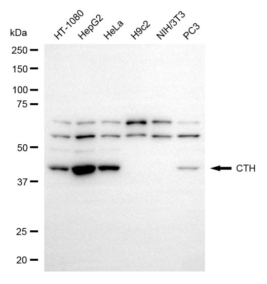Western blotting analysis using CTH antibody. Total cell lysates (30 μg) from various cell lines were loaded and separated by SDS-PAGE. The blot was incubated with CTH antibody and HRP-conjugated goat anti-rabbit secondary antibody respectively.