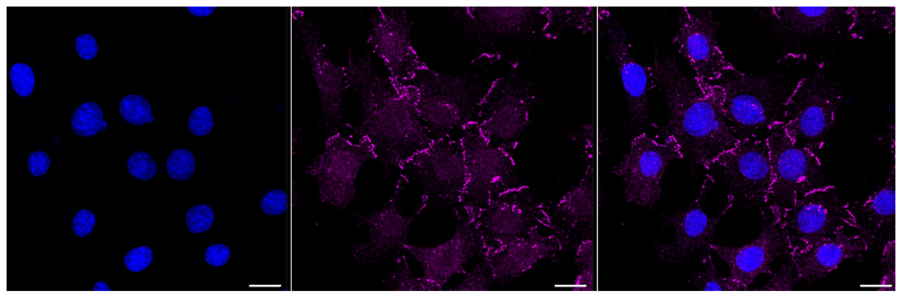 • Immunocytochemical staining of C2C12 cells with beta Catenin antibody. Nuclei were stained blue with DAPI; beta Catenin was stained magenta with Alexa Fluor? 647. Images were taken using Leica stellaris 5. Protein abundance based on laser Intensity and smart gain: Medium. Scale bar: 20 μm.