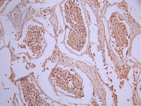 IHC image of CSB-RA108225A0HU diluted at 1:100 and staining in paraffin-embedded human testis tissue performed on a Leica BondTM system. After dewaxing and hydration, antigen retrieval was mediated by high pressure in a citrate buffer (pH 6.0). Section was blocked with 10% normal goat serum 30min at RT. Then primary antibody (1% BSA) was incubated at 4°C overnight. The primary is detected by a Goat anti-rabbit polymer IgG labeled by HRP and visualized using 0.05% DAB.