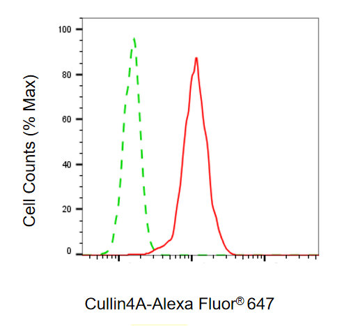 Flow cytometric analysis of Cullin4A expression in HeLa cells using Cullin4A antibody. Green, isotype control; red, Cullin4A.