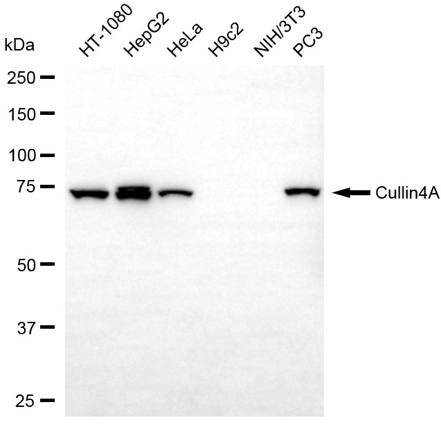 Western blotting analysis using cullin4A antibody. Total cell lysates (30 μg) from various cell lines were loaded and separated by SDS-PAGE. The blot was incubated with cullin4A antibody and HRP-conjugated goat anti-rabbit secondary antibody respectively.