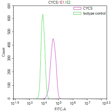 • Overlay Peak curve showing Hela cells stained with CSB-RA194672A0HU (red line) at 1:100. The cells were fixed in 4% formaldehyde and permeated by 0.2% TritonX-100 for 10min. Then 10% normal goat serum to block non-specific protein-protein interactions followed by the antibody (1ug/1*106cells) for 45min at 4℃. The secondary antibody used was FITC-conjugated goat anti-rabbit IgG (H+L) at 1/200 dilution for 35min at 4℃.Control antibody (green line) was Rabbit IgG (1ug/1*106cells) used under the same conditions. Acquisition of >10,000 events was performed.