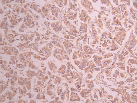 • IHC image of CSB-RA194672A0HU diluted at 1:100 and staining in paraffin-embedded human breast cancer performed on a Leica BondTM system. After dewaxing and hydration, antigen retrieval was mediated by high pressure in a citrate buffer (pH 6.0). Section was blocked with 10% normal goat serum 30min at RT. Then primary antibody (1% BSA) was incubated at 4°C overnight. The primary is detected by a Goat anti-rabbit polymer IgG labeled by HRP and visualized using 0.05% DAB.