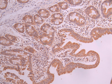 • IHC image of CSB-RA194672A0HU diluted at 1:100 and staining in paraffin-embedded human small intestine tissue performed on a Leica BondTM system. After dewaxing and hydration, antigen retrieval was mediated by high pressure in a citrate buffer (pH 6.0). Section was blocked with 10% normal goat serum 30min at RT. Then primary antibody (1% BSA) was incubated at 4°C overnight. The primary is detected by a Goat anti-rabbit polymer IgG labeled by HRP and visualized using 0.05% DAB.