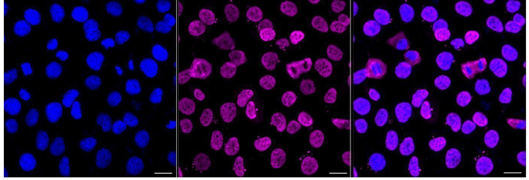 Immunocytochemical staining of HT-1080 cells with DAZAP1 antibody. Nuclei were stained blue with DAPI; DAZAP1 was stained magenta with Alexa Fluor? 647. Images were taken using Leica stellaris 5. Protein abundance based on laser Intensity and smart gain: Medium. Scale bar, 20 μm.