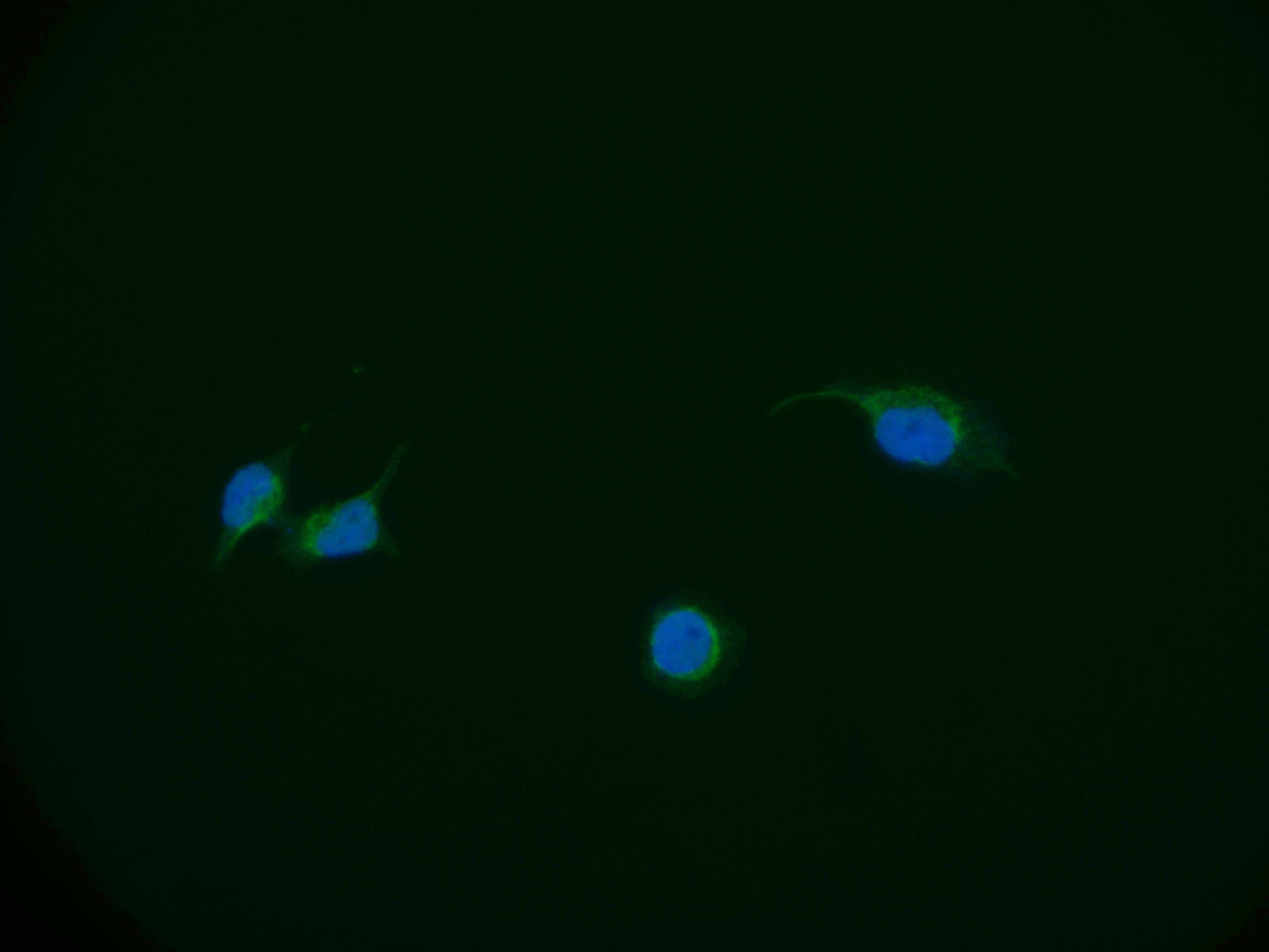 Immunofluorescence staining of A549 cell with CSB-RA155202A0HU at 1:50, counter-stained with DAPI. The cells were fixed in 4% formaldehyde and blocked in 10% normal Goat Serum. The cells were then incubated with the antibody overnight at 4°C. The secondary antibody was Alexa Fluor 551-congugated AffiniPure Goat Anti-Rabbit IgG(H+L).