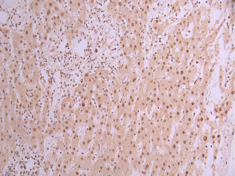 IHC image of CSB-RA066000A0HU diluted at 1:100 and staining in paraffin-embedded human liver cancer performed on a Leica BondTM system. After dewaxing and hydration, antigen retrieval was mediated by high pressure in a citrate buffer (pH 6.0). Section was blocked with 10% normal goat serum 30min at RT. Then primary antibody (1% BSA) was incubated at 4°C overnight. The primary is detected by a Goat anti-rabbit polymer IgG labeled by HRP and visualized using 0.05% DAB.