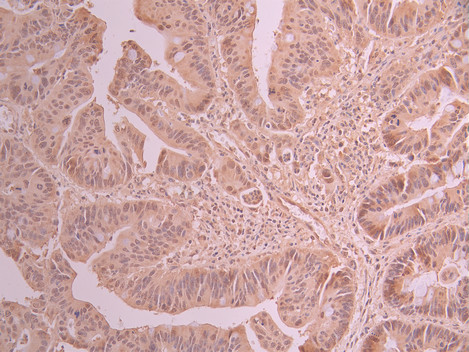 IHC image of CSB-RA209536A0HU diluted at 1:100 and staining in paraffin-embedded human colorectal cancer performed on a Leica BondTM system. After dewaxing and hydration, antigen retrieval was mediated by high pressure in a citrate buffer (pH 6.0). Section was blocked with 10% normal goat serum 30min at RT. Then primary antibody (1% BSA) was incubated at 4°C overnight. The primary is detected by a Goat anti-rabbit polymer IgG labeled by HRP and visualized using 0.05% DAB.