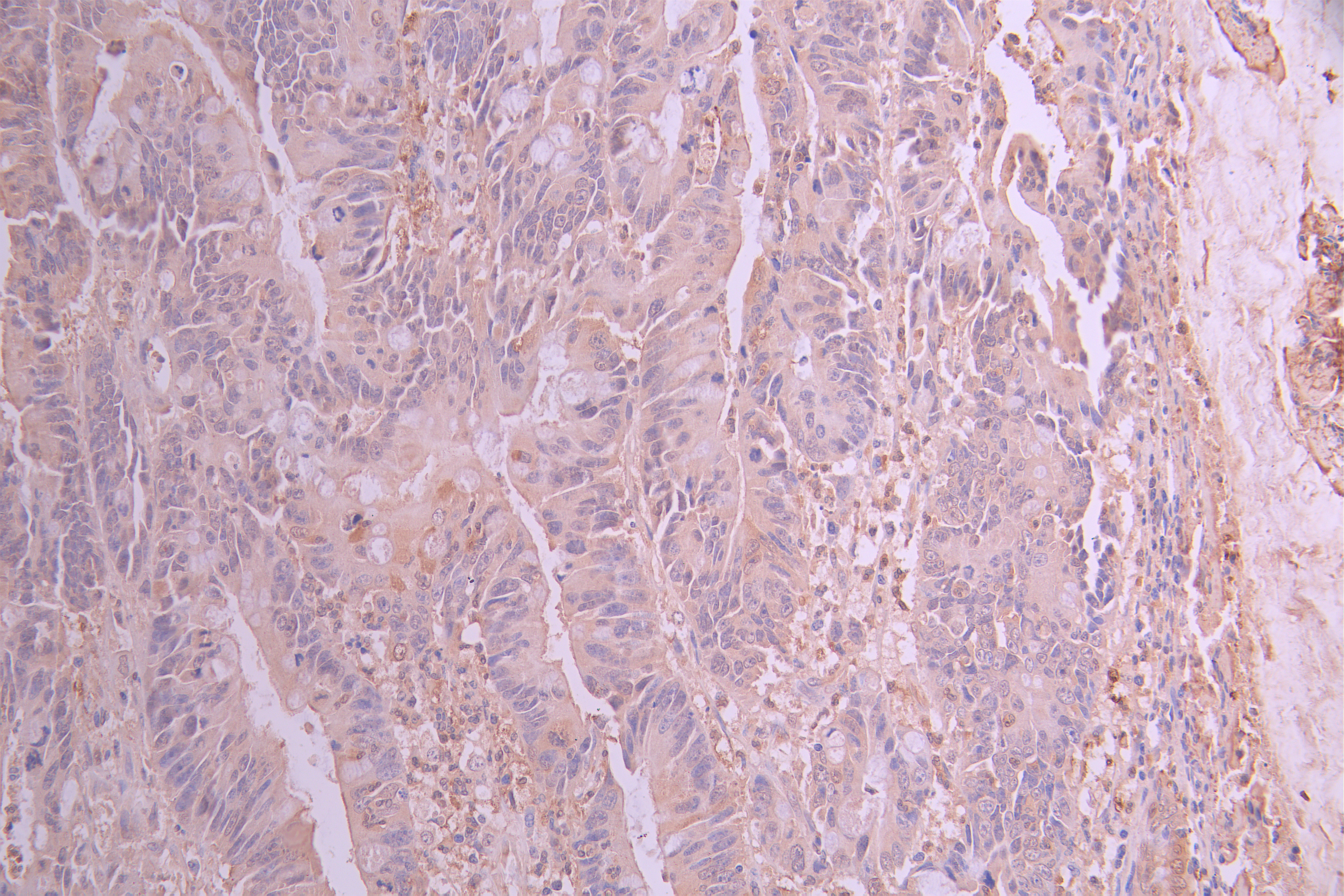 IHC image of CSB-RA136847A0HU diluted at 1:100 and staining in paraffin-embedded human colorectal cancer performed on a Leica BondTM system. After dewaxing and hydration, antigen retrieval was mediated by high pressure in a citrate buffer (pH 6.0). Section was blocked with 10% normal goat serum 30min at RT. Then primary antibody (1% BSA) was incubated at 4°C overnight. The primary is detected by a Goat anti-rabbit polymer IgG labeled by HRP and visualized using 0.05% DAB.