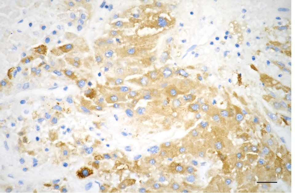 Immunohistochemistry was performed on paraffin-embedded human hepatocarcinoma using DLAT antibody. Antigen retrieval was done in sodium citrate buffer (pH 6.0). DAB was used for detection, with hematoxylin counterstaining. Images were acquired using a Nikon Ci-L Plus microscope (40× objective). Scale bar: 25 μm.