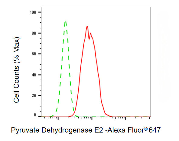Flow cytometric analysis of Pyruvate Dehydrogenase E2 expression in HepG2 cells using Pyruvate Dehydrogenase E2 antibody. Green, isotype control; red, Pyruvate Dehydrogenase E2.